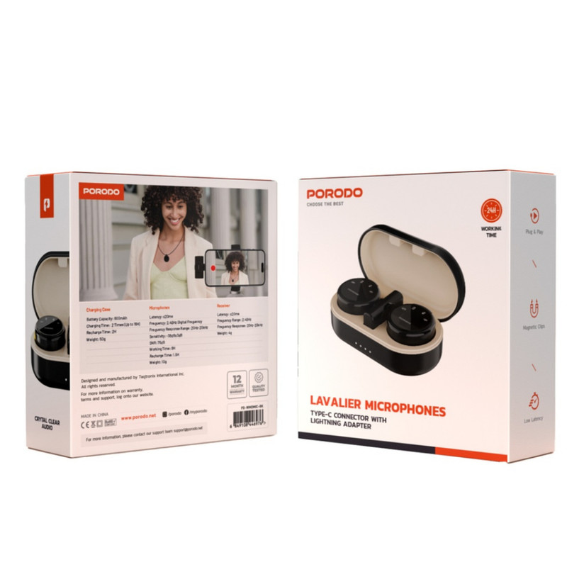 میکروفون Black Porodo Lavalier برای ضبط صدای واضح و واضح طراحی شده است. راحتی و تطبیق پذیری آن به دلیل کانکتور Type-C و آداپتور لایتنینگ که به آن اجازه می دهد با طیف گسترده ای از دستگاه ها کار کند، متمایز است. این میکروفون با یک کیس شارژ 600 میلی آمپر ساعتی ارائه می شود که اطمینان خاطر را در طول جلسات ضبط طولانی تضمین می کند و هر لحظه را ثبت می کند. فناوری تأخیر کم آن، انتقال کامل صدا را برای پخش زنده، وبلاگنویسی یا پادکست تضمین میکند. گیره های مغناطیسی اتصال میکروفون را به لباس شما برای ضبط راحت در حین حرکت آسان می کند. با SNR 75dB، صدایی شفاف را ارائه می دهد و به طور موثری نویز پس زمینه را برای ضبط حرفه ای کاهش می دهد. میکروفون Porodo Lavalier تا 8 ساعت کار را برای تمام نیازهای ضبط صدا ارائه می دهد. با حساسیت -38dB ± 3dB، به طور موثر طیف های مختلفی از صداها را با وضوح ضبط می کند. ضبط صدای عالی را با میکروفون نهایی Porodo Lavalier، با کیفیت صدای عالی، راحتی، و سازگاری برای همه نیازهای ضبط خود کشف کنید.