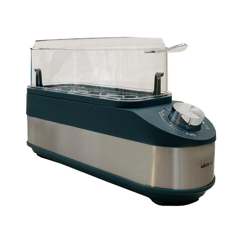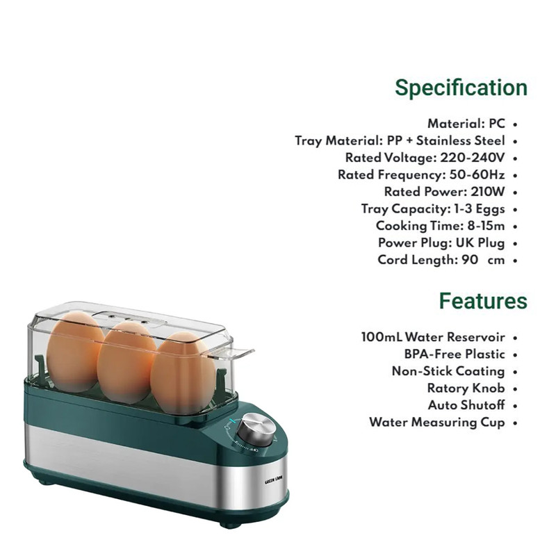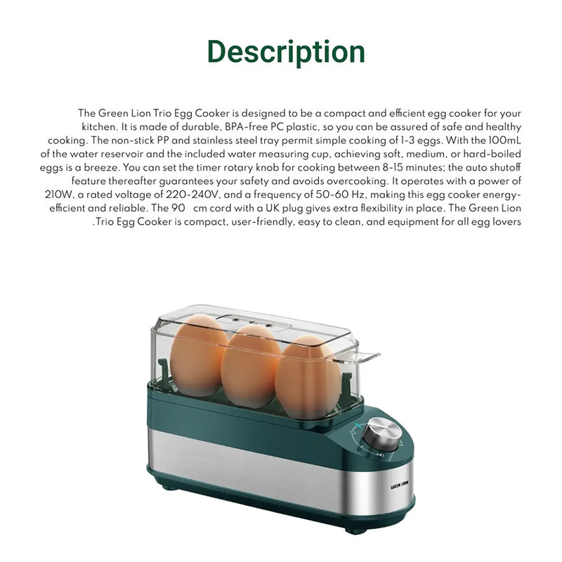 کمپانی گرین لاین از تولید کنندگان به نام در زمینه ی تولید لوازم شخصی و لوازم جانبی دیجیتال می باشد که همواره با توجه به نیاز روز جامعه بهترین و کاربردی ترین محصولات را تولید و روانه بازار می نماید. این کمپانی با طراحی ساده در عین حال کاربردی خود توانسته است نظر کاربران زیادی را به خود جلب کرده و با برند های مطرح و درجه یک به رقابت برخیزد. یکی از به روز ترین تولیدات این برند، تخم مرغ پز مدل TRIO EGG COOKER می باشد که به تازگی به بازار عرضه شده است. تخم مرغ پز گرین لاین مدل GNTRIOEGGGN از به روز ترین و کاربردی ترین محصولات خانه و آشپزخانه است که به شما این امکان را می دهد تا به آسانی و در سریع ترین زمان ممکن از صبحانه ای گرم لذت ببرید. این محصول با طراحی جمع وجوری که برای آن درنظر گرفته شده، کمترین فضا را در آشپزخانه شما اشغال خواهد کرد؛ در نظر داشته باشید برای این محصول یک کابل برق با دو شاخه سه پین به طول حدود 90 سانتی متر برای انعطاف پذیری بیش تر و استفاده راحت تر طراحی شده است که آن را تبدیل به یک گزینه عالی برای آشپزخانه شما نموده است. ظرفیت تخم مرغ پز گرین لاین مدل GNTRIOEGGGN تعداد 1-۳ عدد است که برای استفاده روزمره عالی است؛ لازم به ذکر است که برای این محصول توان ۲۱۰ وات، ولتاژ ۲۲۰-۲۴۰ ولت و فرکانس ۵۰-۶۰ هرتز در نظر گرفته شده است که موجب کم مصرف شدن این وسیله شده و به سبب همین ویژگی توجه کاربران زیادی را به خود جلب نموده است. تخم مرغ پز گرین لاین مدل GL-EC22 دارای دکمه چرخشی تایمر است که می توانید با توجه به نیاز و سلیقه ی خود (نرم، متوسط یا سفت آب پز)، بین ۸-۱۵ دقیقه دستگاه را تنظیم نمایید (در بسته بندی این محصول یک پیمانه اندازه گیری آب و دفترچه راهنما نیز برای استفاده راحت تر کاربران قرار داده شده است.) مخزن آب تعبیه شده برای تخم مرغ پز GREEN LION گرین لاین نیز ۱۰۰ میلی لیتر ظرفیت دارد. همچنین فضای داخلی نچسب و سینی جدا شدنی به کار رفته در طراحی این محصول تمیز کردن فضای داخلی را برای کاربر آسان تر نموده است.