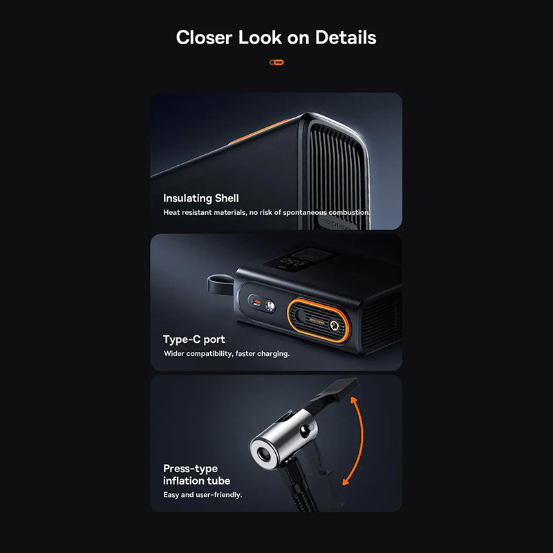 باد کردن لاستیک ها با استفاده از این گجت بصری و ساده است. کمپرسور بی سیم به شما امکان می دهد فشار تایر را کنترل کنید تا از باد شدن بیش از حد جلوگیری کنید. حدود 3.5 دقیقه طول می کشد تا چرخ به طور کامل باد شود. این محصول مجهز به درگاه USB نوع C جهانی است که به لطف آن سرعت شارژ افزایش می یابد. نوک پمپ از فلز ساخته شده است که آن را بسیار بادوام می کند و قفل گیره به این معنی است که هنگام پمپاژ نیازی به نگه داشتن نوک آن ندارید. به لطف نمایشگر LCD داخلی، سطح باتری و فشار به طور مداوم مشخص خواهد شد. این مجموعه همچنین شامل 3 نوع نازل است: آمریکایی – لاستیک ماشین و دوچرخه فرانسوی – موتور سیکلت ورزشی، دوچرخه کوهستان سوزن توپ سازگاری پمپ مناسب خودروها، سایر وسایل نقلیه و لوازم جانبی ورزشی است. شارژ کامل برای موارد زیر اعمال می شود: نظارت بر این دستگاه مجهز به سیستم کنترل فشار باد لاستیک است. شما می توانید آزادانه تنظیم کنید – مقدار هوای لاستیک ها را کاهش یا افزایش دهید تا رانندگی روزمره راحت تر و لذت بخش تر شود. تراشه هوشمند زمانی که فشار باد تایر به حداکثر خود برسد، شارژ را متوقف می کند. کیفیت بالا سازنده از فلز برای ایجاد یک محفظه جامد با بافت ظریف استفاده کرد. نه تنها چشمگیر به نظر می رسد، بلکه پارامترهای مقاومت بسیار خوبی نیز دارد. علاوه بر این، او راه حل هایی را اجرا کرده است که اجازه اتلاف گرما را می دهد – دستگاه بیش از حد گرم نمی شود. این به دلیل وجود 274 سوراخ در هر طرف بدنه است. کابل ها با لاستیک طبیعی پوشانده شده اند که قابل خم شدن است و نمی شکند. عملیات ساده عملکرد این پمپ بسیار ساده و شهودی است. در اینجا از دکمه هایی استفاده می شود که به راحتی زیر انگشتان احساس می شود. با نظارت بر سطح فشار تایر، خطر اضافه بار به حداقل کاهش یافته است. شما دکمه های زیر را در اختیار دارید: M – فشار کوتاه دستگاه را روشن می کند، با نگه داشتن 3 ثانیه بین حالت ها تغییر می کند. +/- – یک فشار کوتاه برای افزایش یا کاهش مقدار هوای پمپ شده کافی است. OK – 3 ثانیه فشار دهید و نگه دارید تا خاموش شود، نور – فشار دهید تا چراغ روشن شود، دوباره فشار دهید تا چراغ بارق روشن شود، دوباره فشار دهید تا چراغ SOS رو