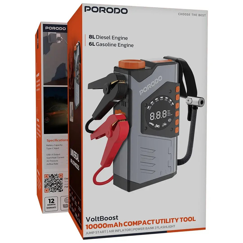 ابزار چندکاره Porodo VoltBoost PDPBA10GY ترکیبی از پاوربانک 10000 میلیآمپرساعتی، جامپاستارتر خودرو و کمپرسور باد قابلحمل است. این محصول با طراحی فشرده و بدنه مقاوم، گزینهای ایدهآل برای استفاده در خودرو، سفر یا شرایط اضطراری بهشمار میآید. توان استارت لحظهای آن تا 1200 آمپر میرسد و برای خودروهای بنزینی تا 6 لیتر و دیزلی تا 8 لیتر مناسب است. همچنین کمپرسور داخلی دستگاه میتواند فشار باد را تا 150 PSI تأمین کند و دارای نمایشگر دیجیتال جهت نمایش میزان شارژ و فشار باد میباشد. پورتهای USB-A و Type-C امکان شارژ سریع انواع دستگاهها را فراهم کرده و ولتبوست را به یک همراه همهکاره و مطمئن تبدیل کرده است.