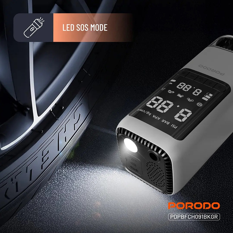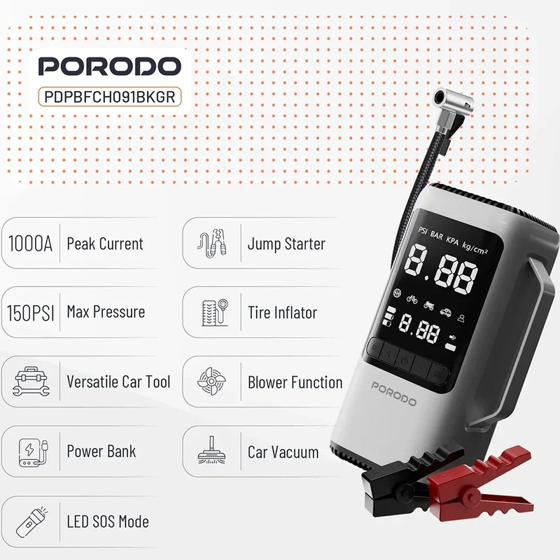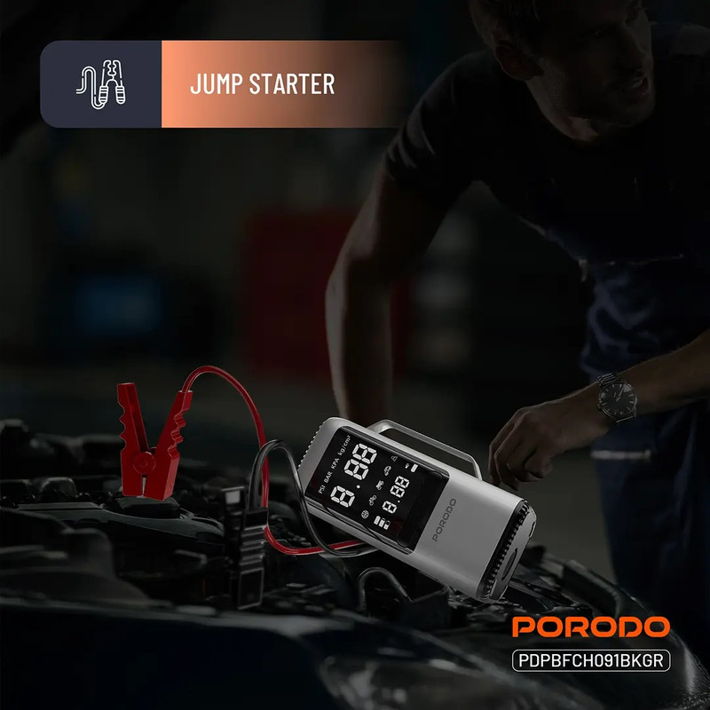 | روش استفاده | دستگاه Porodo PDPBFCH091BKGR یک ابزار چندکاره مخصوص خودرو است که قابلیت جامپ استارت، پاوربانک، پمپ باد، جاروبرقی و چراغ LED اضطراری را در یک محصول ارائه میدهد.برای روشن کردن خودرو، گیره قرمز را به قطب مثبت و گیره مشکی را به قطب منفی باتری وصل کرده و پس از استارت، آنها را جدا کنید. با پورت USB میتوانید گوشی و گجتهای مختلف را شارژ کنید. برای باد کردن تایر، شلنگ را وصل کرده و فشار مورد نظر را تنظیم کنید؛ دستگاه پس از رسیدن به مقدار مشخص به صورت خودکار خاموش میشود.امکان استفاده از جاروبرقی داخلی و چراغ LED با حالت SOS نیز وجود دارد. قبل از استفاده شارژ دستگاه را بررسی کرده و پس از کار، آن را در محیط خشک نگهداری کنید. اتصال صحیح گیرهها برای جلوگیری از آسیب بسیار مهم است. |